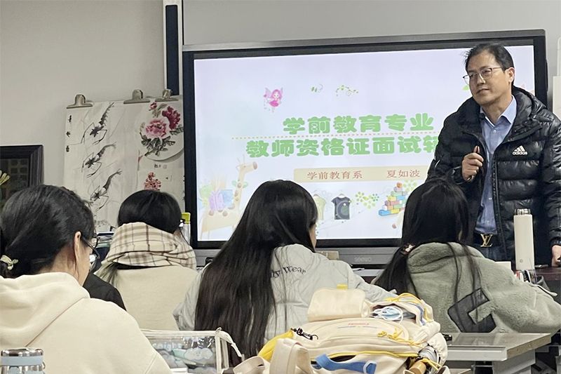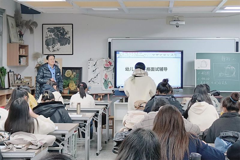 教科网11月23日电(记者 韩静茹)为了进一步增强学生专业素质,提高面试通过率,11月22日晚,教育科学学院学前教育专业在教科一号楼画室举办教师资格证面试辅导会。辅导会由教科院副院长任红娟主持,学前教育系夏如波老师主讲,2106班、2107班全体同学参会。