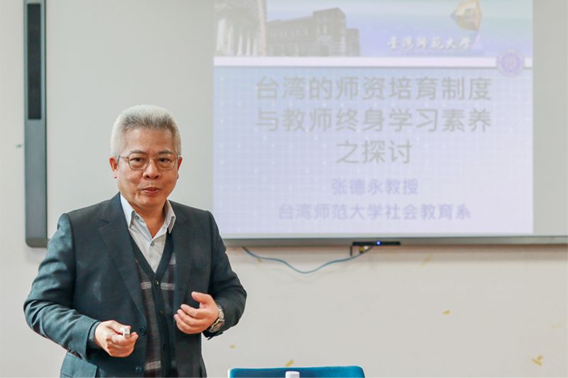 教科网11月27日电(记者 晏紫灵)为进一步了解台湾教师教育制度的变革和现状,共同交流探讨教师终身学习素养,11月25日下午14:00,淮阴师范学院教育科学学院于教科楼1号楼203教室开展“台湾的师资培育制度与教师终身学习素养之探讨”专题讲座。本次讲座由教育学系主任任建波主持,特邀台湾师范大学张德永教授主讲,教科院党委书记葛军、院长曹如军等学院领导、学系主任和书记、部分老师、小学教育专业研究生参加。