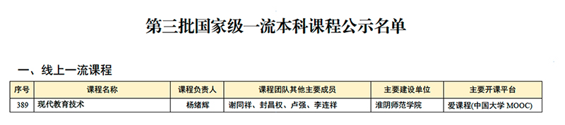 教科网8月23日电(记者 张菁菁)近日,教育部公示了《第三批国家级一流本科课程认定结果》,由我院杨绪辉教授主持的《现代教育技术》课程成功获评线上一流课程。这一成果不仅实现了我院高质量课程建设的又一突破,更为学院教学改革与高质量发展提供了有力支撑。