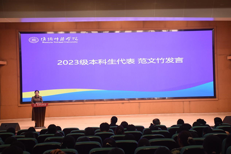 2025级研究生代表安楚媛表达了能够继续在淮师教科院学习的自豪与喜悦,并结合自身经历,与新生分享了三点期待:永葆“归零”心态,做一名勤勉的求知者;锤炼“坚守”毅力,做一名踏实的奋进者;拥抱“多元”集体,做一名积极的合作者。2025级本科生代表滕思?;赝咧校雇笱?,表达了对大学生活的憧憬与期待。同时,她与在座同学们共同约定,追求梦想,携手成长。2023级本科生代表范文竹结合现阶段的收获,向大家传递了三点感悟:知行合一,止于至善;拓宽视野,滋养心灵;主动探索,勇敢追梦。
