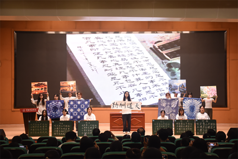 音乐悠扬,书画情长??У淅裆希炭圃焊髯ㄒ涤判阃殖≌故玖耸榉ā⒒婊?、扎染等师范生专业特色技能,为全体新生展现了作为教科学子扎实的专业基础和良好的综合素养。全体师生合唱《歌唱祖国》,于铿锵的旋律中厚植家国情怀,描摹出未来大学生活的璀璨画卷。