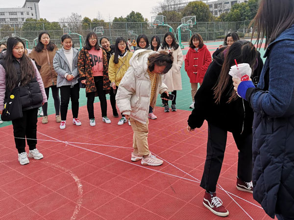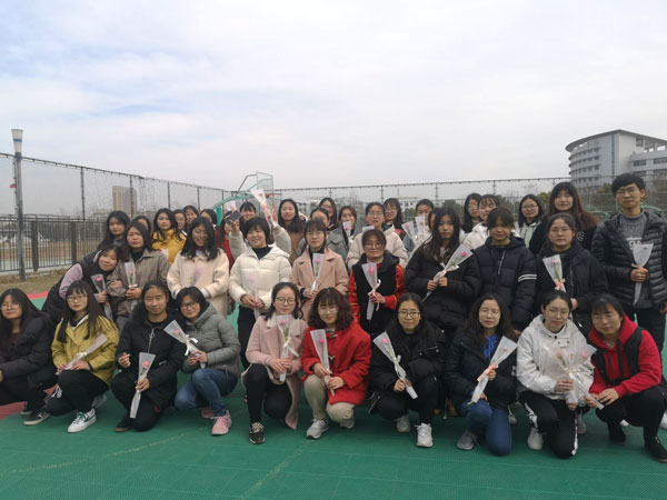 活动开始,张雨柔、丁雨悦展示双人花样跳皮筋,灵活的脚步令大家呼声连连。一部分人排成一列进行多人跳皮筋活动,重拾儿时记忆,锻炼腿部力量,发展身体的协调性和灵敏性。全体同学排成舞蹈课队形,在操场跳《娃哈哈》舞蹈,优美的舞姿使操场上来往的同学们频频回头。一支舞蹈结束,严格指导同学们围在一起,合影留念,看着蓝天白云下的同学们绽开的笑脸、真实的欢乐,作为班级团支书,她感触到:“这是我们班第一次一起度过女生节,大家一起参与活动不仅收获了女生节的快乐,还提高了班级凝聚力。”韩鹏手捧42朵花束,依次赠送给班里的女生,并送上节日祝福,作为班里唯一男生,他活泼的性格常给班级带来欢乐。