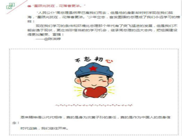 学习楷模精神,感受人格魅力。传承恩来精神,砥砺深情大义。值周恩来诞辰之际,教科院全体师生通过多种途径深切缅怀周总理的丰功伟绩,学习他的革命精神和崇高品质,进一步激励教科院全体师生深入贯彻恩来精神,提升学院师生思想的高度性与先进性,明确人生目标,建立有价值意义的人生追求。