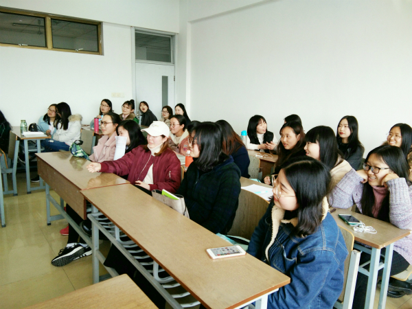 图为教科1409班的同学正在听团支书介绍周总理的丰功伟绩 记者 韦佳岐 摄