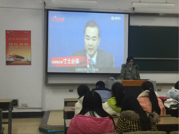 图为教科1503班的学生正观看外交部长在两会上的发言 记者 吴泽钰 摄