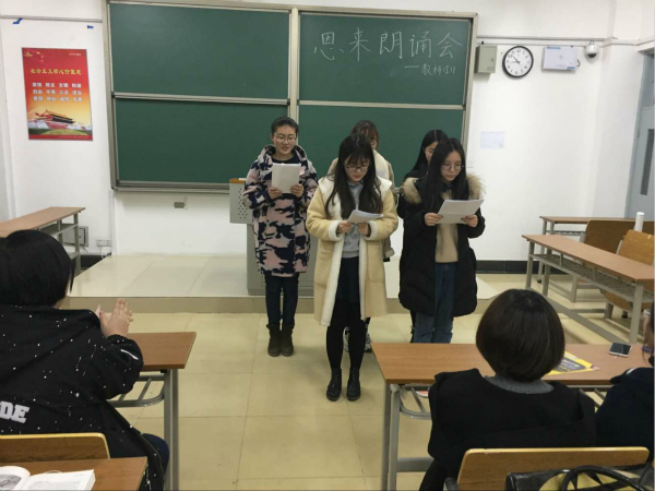 教科1511一直致力于打造周恩来班级,朝着这个方向,该团支部从未停止过行动的脚步。此次活动的第一个环节,便以一个新颖的方式向恩来先生致敬,“阳春时节/西花厅的海棠花/又要开了/我知道/他只为一个人而开/我的忧伤在春天/大爱无边的海棠花/是冬天越堆越高的冷/是西花厅越积越厚的霜/是你越刻越深的纹……”朗朗的读书声忽然响起,班级里三位阅读功底较好的同学通过声情并茂的朗读立刻渲染出伤感的氛围,其他同学则马上被调动了情绪,专注地聆听着这首由李道立前辈为怀念周恩来总理的丰功伟绩而特别创作的诗歌。一花一世界,三月的忧伤,在此刻淋漓尽致地倾泻着……