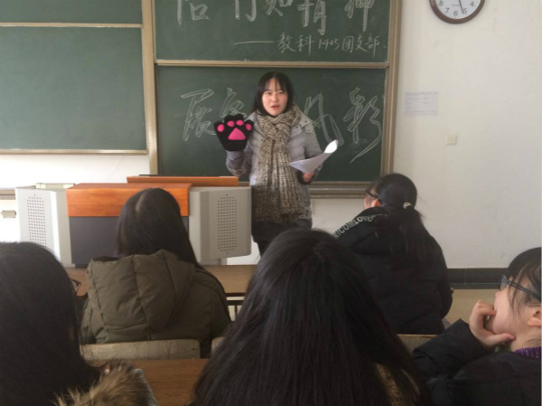 11月24日下午两点,教科1405 班围绕传承与弘扬陶行知先生的育人精神,开展“悟行知精神,展卓越风采”为主题的团日活动。活动由三个游戏进行,首先是“就不听指挥”的游戏,规则大致为分两队人,每队七个人,分两次进行,指挥者手戴一个卡通手套,先有其中一队排成一列依次上前,出题人用手迅速的指向一个方向,并且说“看这边”,然后挑战者必须看向另一个方向(左右上下),这个方向必须和出题人指的方向不一样。若相同则为失败,输的一方要集体为大家分享一个关于陶行知的小故事。同学们十分积极,踊跃参加,由于其中第一队的同学反应不够迅速,出了不少笑话,相比之下第二组反应则好的多。最终,第二队赢得胜利,那第一队的同学就分享了一个关于陶行知的有趣教育故事,大家听的都津津有味。接下来,趁着热烈的气氛,继续起第二个游戏“一只青蛙”,规则是全班同学参与,跟不上节奏或出错者罚节目。主持人说完规则后,就从第一个同学开始,开始时同学们还可以跟上,到了后面一句话时就有点乱了节奏,慌张中更添紧张气氛。最后,张同学卡住了。在全班的鼓掌声中,张同学表演了一首关于陶行知的诗朗诵,十分精彩。紧接着,“耳语传真之行知名言汇”游戏将气氛烘托到顶点,是分组PK,每组派一代表抽取写有陶行知的名言警句的纸条并交给主持人,主持人分别对列头兵耳语纸条上的话,这句话为不让其他人听见,要求照此往下传,有列尾者报出结果,看两列队伍哪个保真度更高,以次结胜负。接下来要将输的一组中出错的人找出来,且这位同学要将抽取到的名言警句面对面对着同组人员一一大声朗读。这次是以宿舍为单位出做游戏的人,被推选的同学都兴致很高,一个接着一个耳语,很神秘。大家以为这个游戏很简单,没想到两组最后的保真度都有损,最终按相似度,第一组险胜,游戏中的陶行知名言也深深的刻入同学的脑海中。游戏虽然简单,但传递的寓意却不简单!