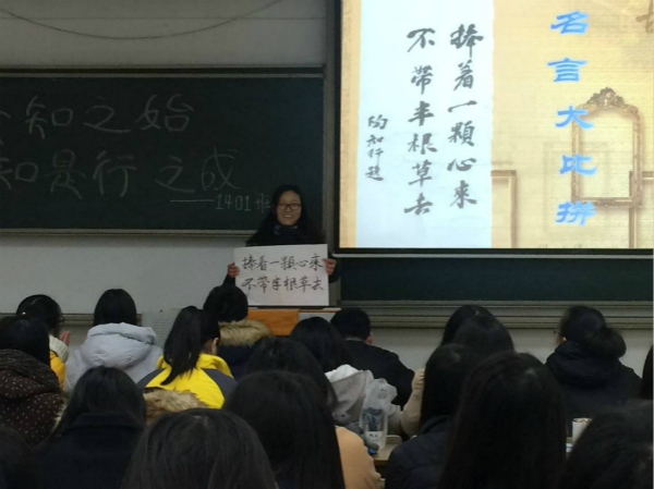 此次主题团日活动在本班团支书的带领下进行,首先团支书带同学们“走近陶行知”——了解陶行知先生的生平事迹。接下来同学们认真倾听《四颗糖果》的故事,投入观看有关图片,共同学习行知精神。侍效梦同学上台展示自己的书法作品,内容为:“捧着一颗心来,不带半根草去。”背景音乐播放着《感恩的心》。随着屏幕上一段段文字的滚动,同学们沉浸在陶先生的精神品质中久久不能自拔。此次活动感染了在场的所有人,最后在大家热烈的掌声中落幕。