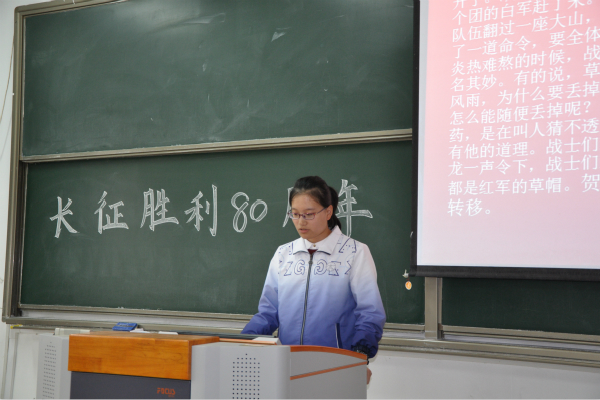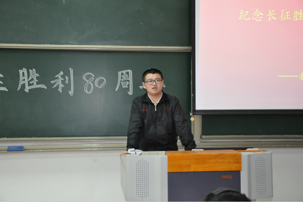 活动进入尾声,16级团支书王子韩同学主动请缨发表了自己对红军长征的见解,“红军不怕远征难,万水千山只等闲,五岭逶迤腾细浪,乌蒙磅礴走泥丸……长征,是一首雄壮、豪迈、大气磅礴的革命交响曲!还记得80年前红军二万五千里长征的艰辛,它见证了我们中华民族的艰险历程,体现了中国的辉煌,矗立起长征者不怕牺牲,勇往直前,不畏艰险,不屈不挠,积极进取,自力更生,艰苦奋斗英勇的雕像……”,学妹的发言震撼人心,却又发人深省。随着新中国的发展,我们更应该好好发扬长征精神。比如,在学校里,我们应主动帮助、关心身边的同学;在家里,我们要尊敬父母等等。