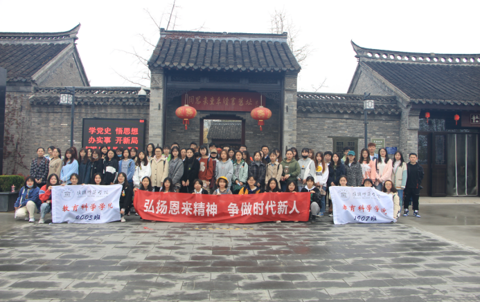 伟大的事业需要伟大的精神,伟大的精神需要后代的传承。教科1907团支部和教科2005团支部一同前往钵池公园,探寻周恩来过去的形迹,学习党史思想。参览结束后同学们唱响了团歌,以赞颂周恩来高尚的思想情操,展现淮师学子对周恩来总理的敬佩之情。