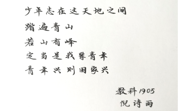 青年者,人生之王,人生之春,人生之华也。新时代中华民族的伟大复兴梦,面临前所未有的机遇,也面临诸多挑战,这更需要青年人不断奋斗,将个人志与中国梦紧紧相连。教科1905团支部的倪诗雨挥笔写下了自己的豪情满志,一笔一划间尽显其作为青年的远大理想,生逢盛世,当肩负重任。