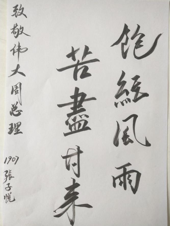 为了让同学们了解周总理的光辉事迹及名言名句,同时提高书法水平。支部成员展示了活动前完成的书法作品。张子悦同学深情致敬周总理:“饱经风雨,苦尽甘来”。还有多位同学也写下了优秀的作品。