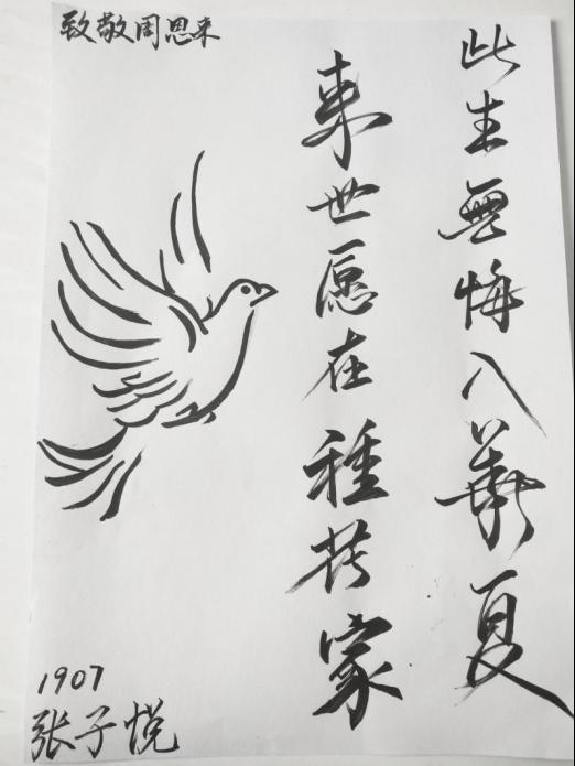 吴静雯同学品读周总理原著写下感悟,深刻学习到了周总理提出的实事求是,脚踏实地为人民服务的工作精神,并自勉愿不负韶华,以梦为马,努力为党和国家贡献自己的力量。张子悦同学泼墨挥毫三幅,其中便有对祖国的深情告白:“此生无悔入华夏,来世愿在种花家”。此外,多位同学也纷纷执笔挥墨,写下不凡的作品。