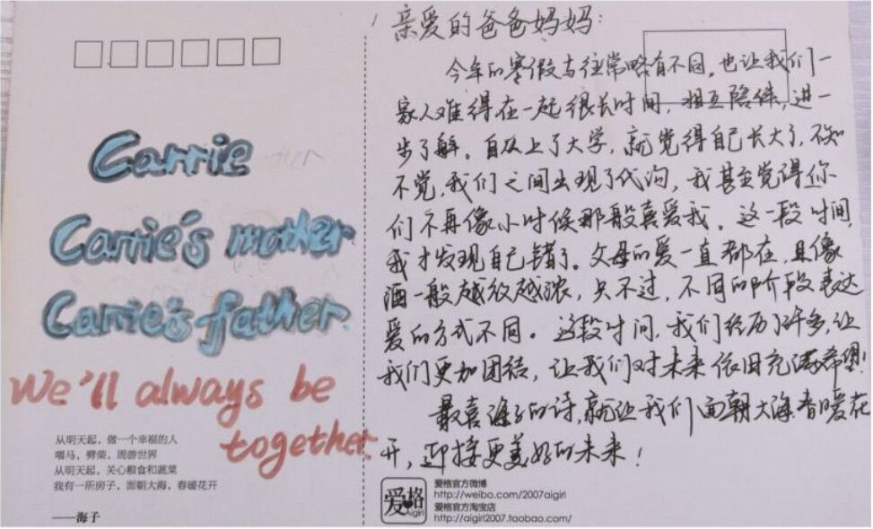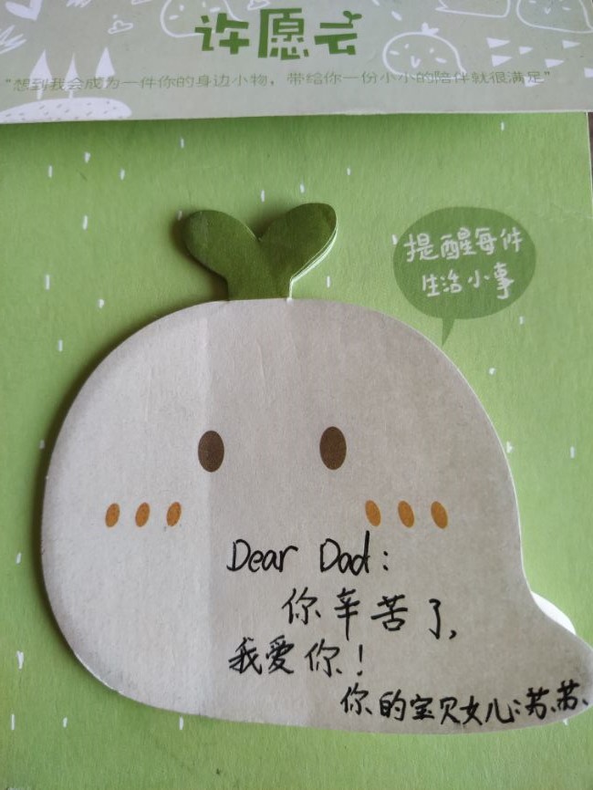 本次活动以文字的形式,在便利贴上写下自己想对父母说的话。一句“我爱你”胜过了千言万语,1604班的尹苏亚同学用这一句“我爱你”表达了她对爸爸深深的爱!