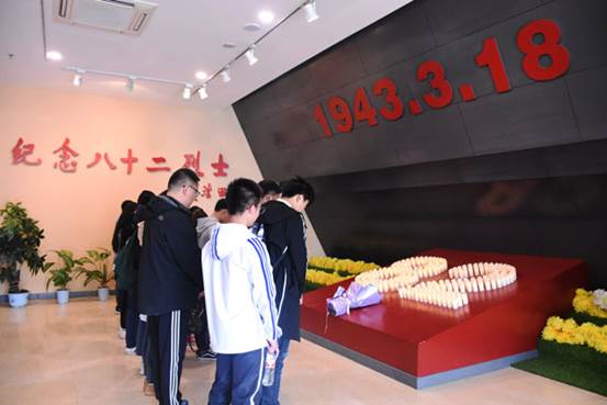 “日军改变战术,集中所有的山炮、九二步兵炮、迫击炮、掷弹筒,向4连阵地轰击,一时弹如雨下,烟尘滚滚。伤亡不断增加,但勇士们硬是凭着比钢铁还坚强的革命意志,死死地坚守在阵地上?!倍弊逖?/span>1710班刘晓林在纪念馆第二展厅激动地回忆电影《刘老庄八十二壮士》中的情节并向周围的同学分享道:“在一片气壮山河的喊杀声中,勇士们端起刺刀,与敌人展开了白刃战。刺刀捅弯了,战士们就用枪托砸;枪托砸碎了,就用小锹砍;小锹砍断了,就用牙齿咬。一场悲壮的肉搏战终因力量悬殊,四连八十二名勇士全部倒在这片湿润的土地上。纪念馆里的东西真是高度还原了历史,当我看到衣物、枪支、电话、等物时,我脑海中的电影也在放映着,让我感慨万千,这部红色经典让我落泪了,它丝毫不逊于我看过的好莱坞大片,尤其是听到冲锋号时,与其说被艺术感动,我更愿意相信那是真实。烈士不应该无名,烈士应该永远被记住。”电影分享结束后,陈萌组织学生们在纪念馆前进行默哀仪式。他们纷纷表示回去之后一定会重温经典,铭记历史。