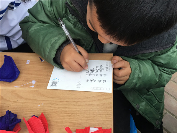 图为小朋友现场给妈妈写贺卡。记者 张玲焱 摄