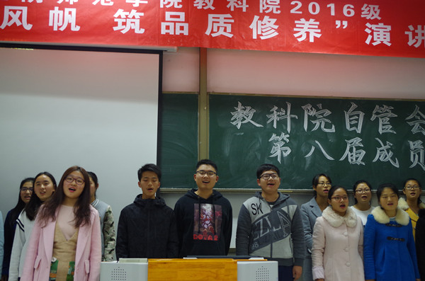 表演结束,自管会主任马春雪发表讲话。她希望每一位同学都能够积极地为教科院自管会贡献自己的一份力量,“自管会是一个大家庭,需要同学们积极融入,和谐相处,使它成为一个快乐的大家庭”。她鼓励同学们好好利用四年大学生活,多参与活动,多学习知识,对自己负责,对未来负责。