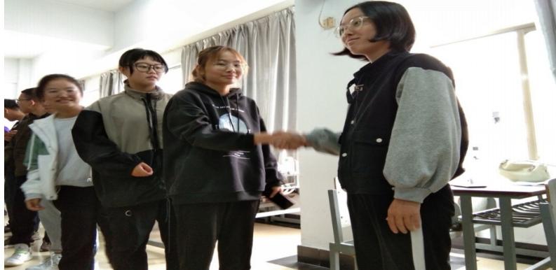 四五个同学一组握手进行自我介绍,交流自己的兴趣爱好。简单的握手礼互相认识一下,彼此开始熟络起来。进行自我介绍时候,大家全部都面带微笑,眼睛看着对方的眼睛,进行一次愉快的谈话。