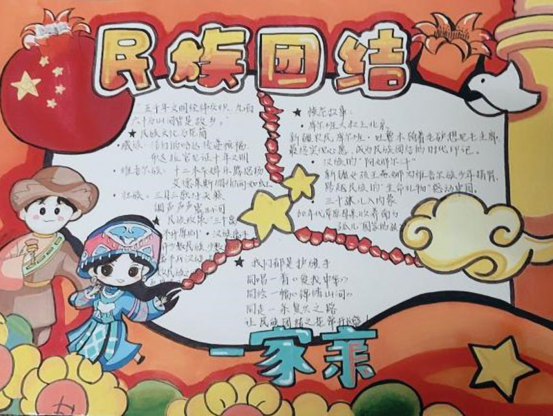 本次活动充分展现了同学们的创意才华,大家围绕民族语言、服饰文化、风俗习惯等多元主题展开创作。设计完成的手抄报作品色彩明丽、内涵丰富,既有用斑斓色块勾勒出的民族服饰图谱,也有以遒劲笔触书写的民族发展史诗,更不乏通过精美插画与隽永语句展现的文化特质。各族学子以画笔再现了民族文化长廊的璀璨图景,用文字镌刻下对民族团结的真挚礼赞,不同作品或聚焦传统纹样的艺术解析,或着力历史脉络的梳理呈现,皆生动诠释了中华文化的多样魅力与交融之美。