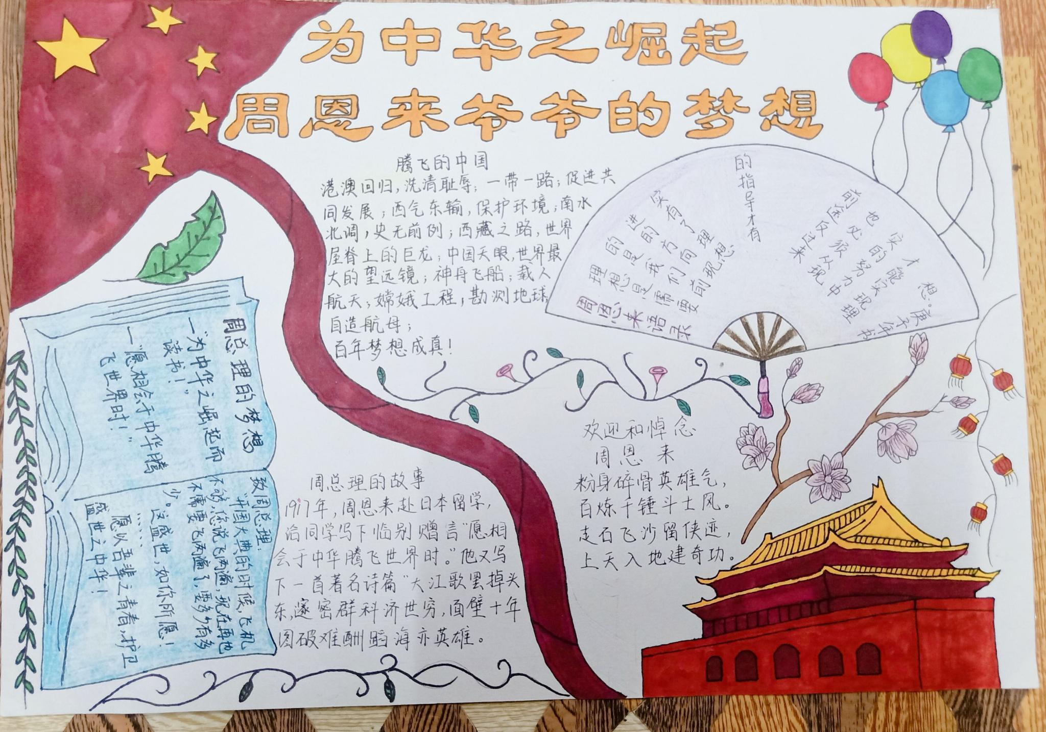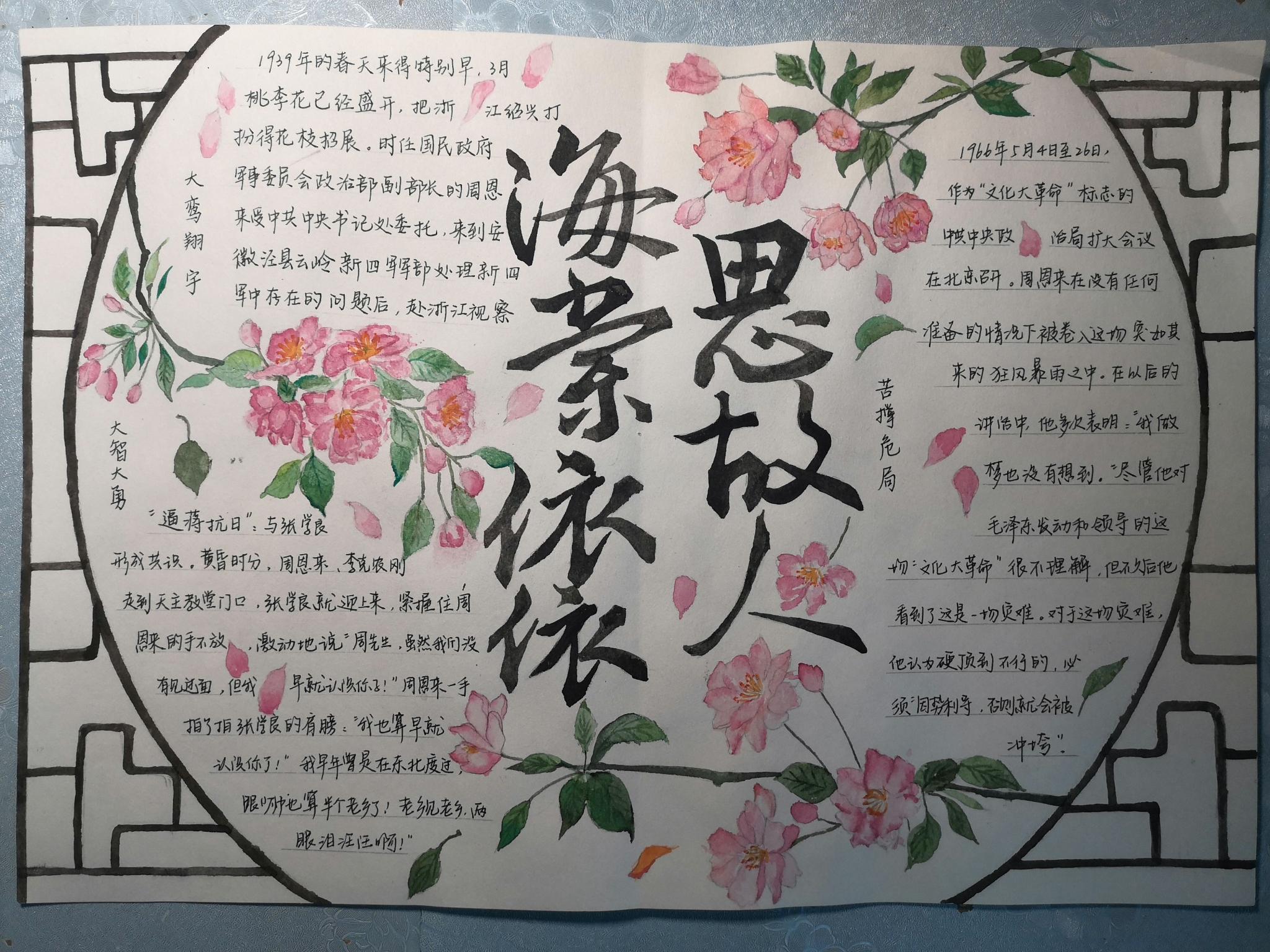 活动的内容有书法、征文和手抄报。书法包括硬笔和软笔书法,选手们自备工具,书写与周恩来精神相关的诗句。书法组选手沉心静气,精心准备书法作品。征文组选手广集素材,弘扬新时代能量。手抄报组选手独立创作,规划布局,绘出周总理的风采。