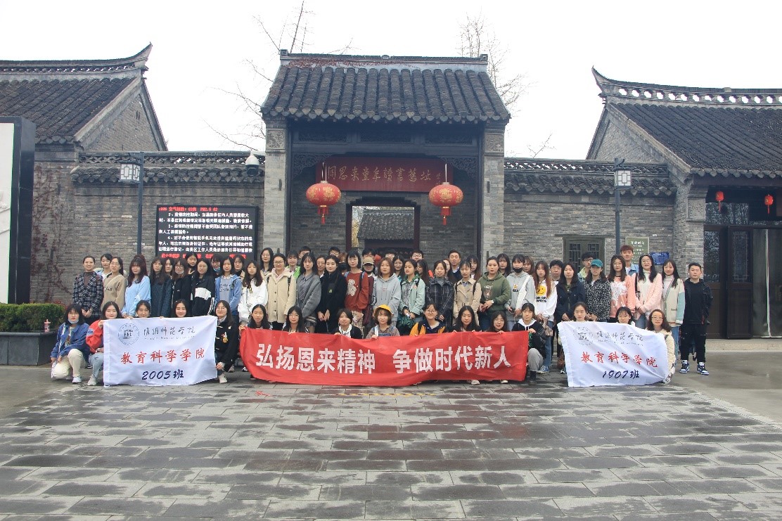 教科网3月31日电(记者 华隽超 高羽佳)为了更好地展现青年一代奋发向上的青春面貌,进一步增强团员们只争朝夕,不负韶华,砥砺奋斗的精神,激励和引领团员们时刻牢记周恩来精神,2021年3月27日,教科2005团支部与教科1907团支部联合开展了主题为“春日踏旧址,夙夕忆恩来”的团日活动。此次活动由2005团支部和1907团支部共同举办,2005团支部书记华隽超与1907团支部书记罗未共同主持本次活动,教育科学学院党委副书记滕祥老师出席活动。