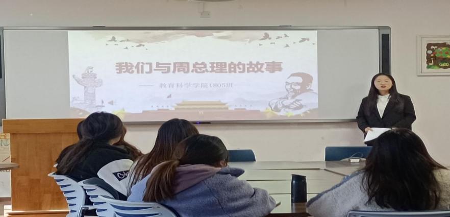 顾伊荻老师发言完毕后,全体师生齐唱中国共青团团歌。接着,主讲人沈彤同学介绍了周恩来总理以及淮师开展创建州恩来班活动的目的和要求,引导淮师学子深入践行周恩来精神,勇挑时代重担。之后,主讲人重点介绍创建周恩来班的四个阶段,旨在让各班团支书对周恩来班的创建有初步的了解,引导各班积极创建。