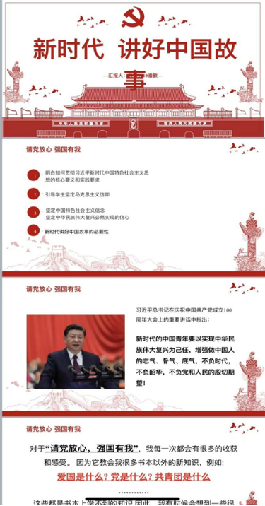 在活动一“请党放心,强国有我”中,同学们展现了自己眼中的新时代青年,通过PPT的形式分享独属于自己的思考,大家通过这种形式表达了心系祖国,想为其出一份力的豪情壮志。
