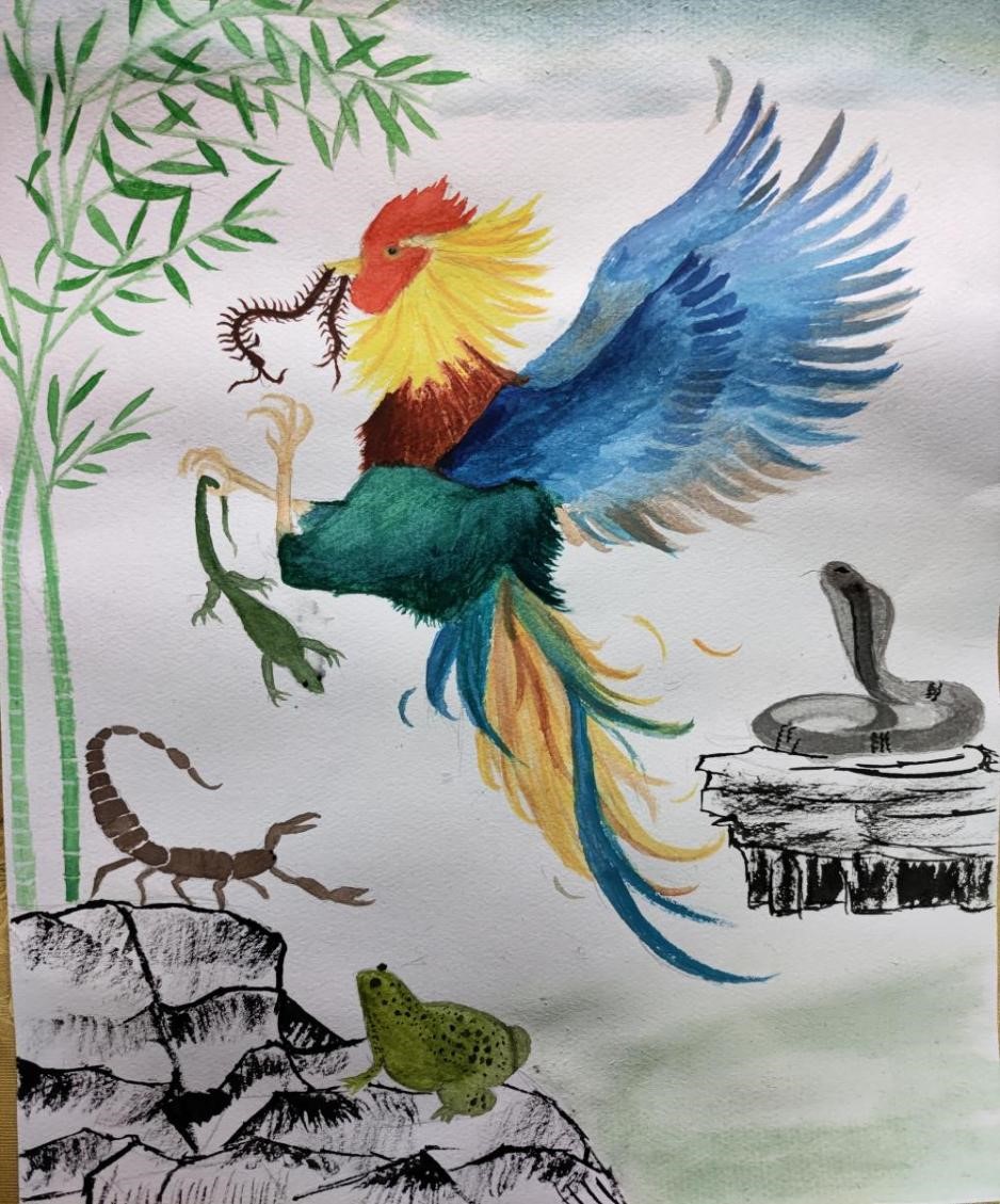 谷雨贴,属于年画的一种,上面刻绘神鸡捉蝎、天师除五毒形象或道教神符。由于谷雨以后气温升高,病虫害进入高繁衍期,为了减轻病虫害对作物及人的伤害,农家一边进田灭虫,一边张贴谷雨贴,进行驱凶纳吉的祈祷。“谷雨贴”反应了人们驱除害虫及渴望丰收平安的心情。图为2107唐佳琪同学的作品,这幅画将公鸡除害的形象表现的惟妙惟肖,生动表达了对来年谷物丰收,家庭和睦安康的祈愿。色彩丰富,主次分明,构图巧妙,表现极具张力,实属一幅佳作,值得大家学习。