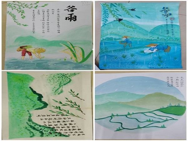 同学们的书画作品生动描绘了谷雨时节雨霏霏,山青草绿柳带斜,农人汗水辛勤淌的情景。唯美的诗句与秀美的景色结合,可谓诗情画意,给人带来审美享受。