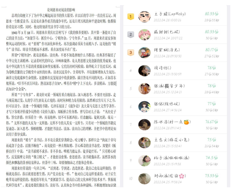 左图为优秀征文作品,右图为知识竞赛成绩截图。