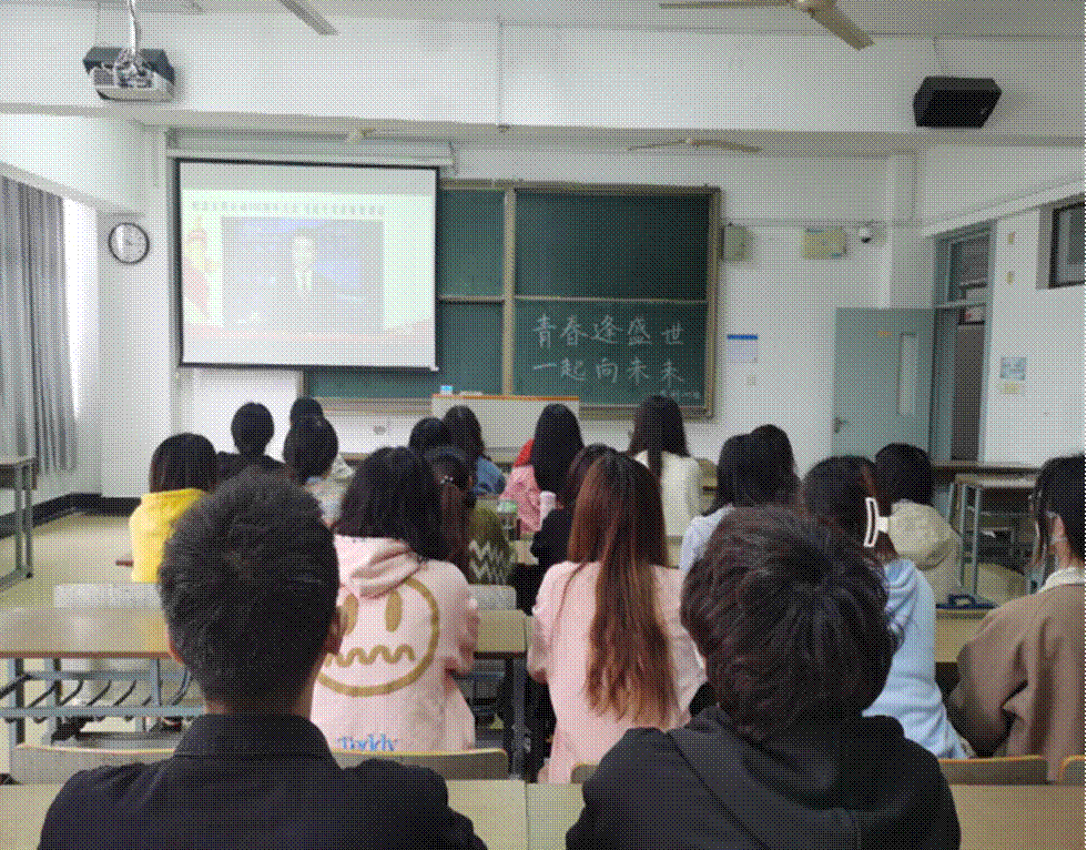 图为同学们正在观看纪念五四运动一百周年大会的新闻。记者 姜子欣 摄