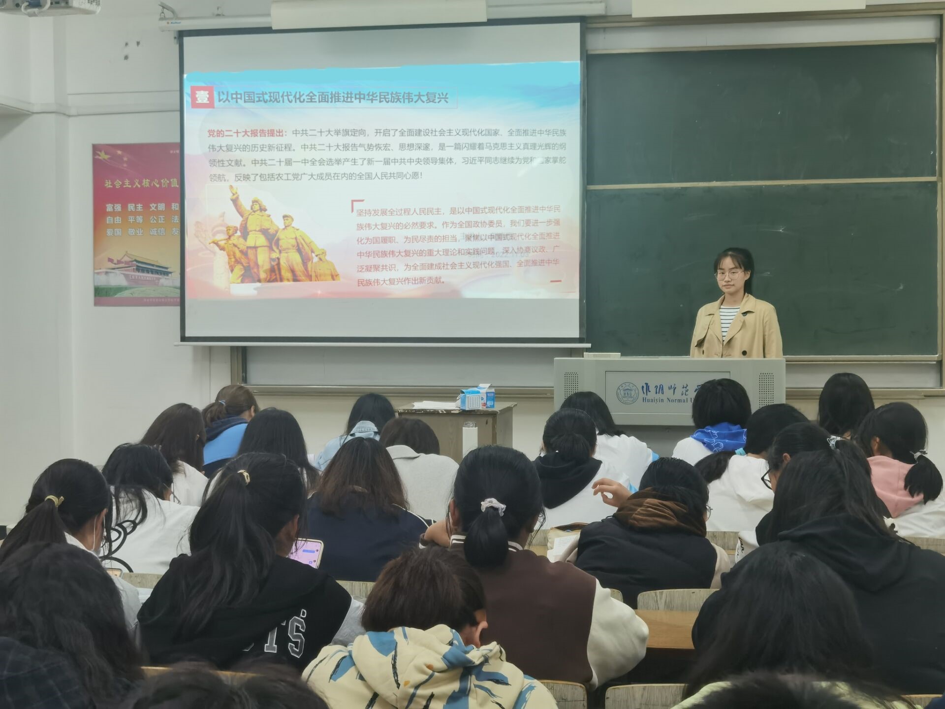 朱依洁从“在思想上同心同德”、“在政治上旗帜鲜明”、“在行动上紧紧跟随”三个方面,引导在校广大青年认真学习、贯彻落实党的二十大精神,为社会主义现代化建设贡献自己的力量。