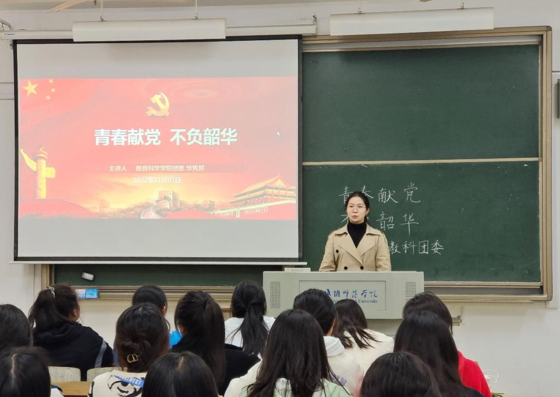 教科网11月26日电(记者 姚一凡 卞若曦)为庆祝中国共产党第二十次全国代表大会胜利闭幕,强化22级新生对大学生活的认识,引导新生树立正确理想信念,砥砺品格,激发奋斗的热情,11月3日,教育科学学院团委于崇文楼1-406开展以“青春献党,不负韶华”为主题的梦想公开课。此次团课由教育科学学院团委副书记华隽超主讲,2205班全体同学参会。