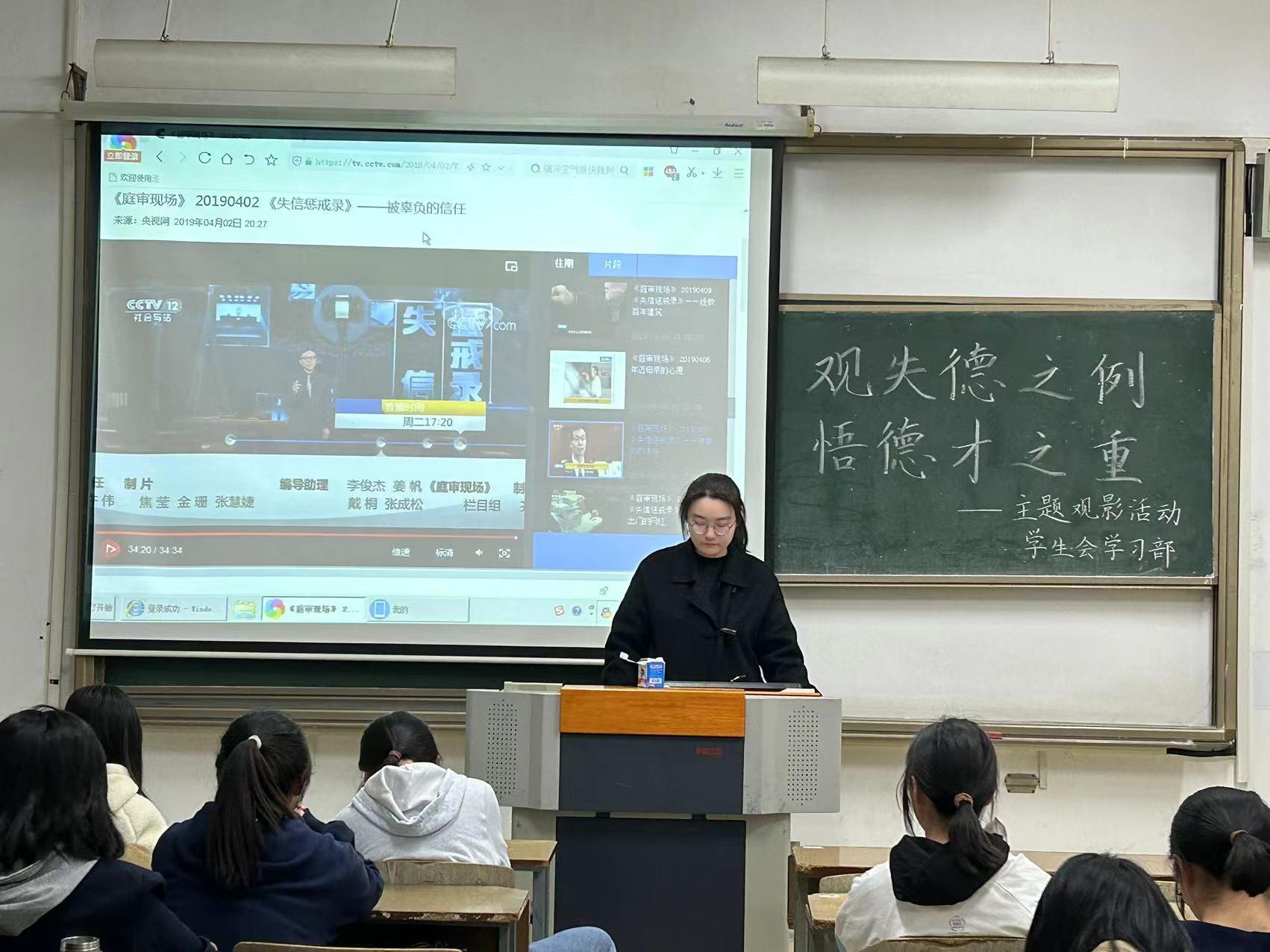 本次活动选择的影片是《庭审现场——年迈母亲的心愿》和《庭审现场——被辜负的信任》,第一部影片讲述了家住云南省弥勒市的陈汝芬老人因家庭矛盾,被家中子女赶出家门,陈老太想到自己年事已高,未来生活难以保障,彻底寒心的老人将三子女告上法庭,本是血浓于水的亲人就这样对薄公堂。第二部影片讲述了四川省资阳市安岳县的任某事业有成,回到家乡带动农村发展,受到人民的信任与欢迎,结果任某由于管理疏忽造成很大的经济损失,此时的他忘记初心,只是一味拖欠土地款,村民一时难以接受,冲突四起。两部影片分别从子女不孝、经营失信两个角度,通过反面形象揭示了失德的代价,从而警示同学们要远离失德行为,树立正确道德思想。观影结束后,大家踊跃发言,并结合影片发表了自己的观后感。