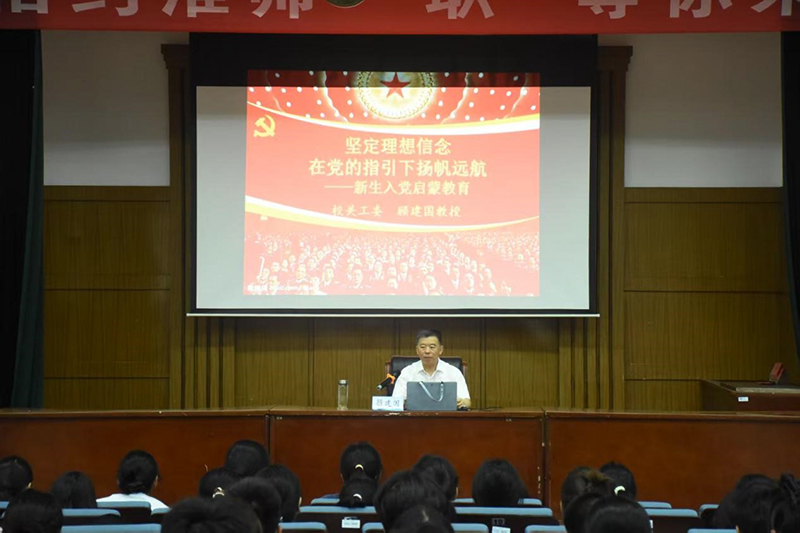 接着,顾建国指出,加入中国共产党要有“一个坚定”“一个主动”“二个了解”。他表示,端正入党动机,是争取入党的首要问题,并向同学们详细地介绍了入党流程及党员组织发展的基本程序。最后,顾建国呼吁全体2025级新生接续奋斗、勤奋学习、筑梦未来,把个人的理想和追求融入到国家和民族伟大复兴的新时代进程中,积极主动地接受党组织的培养和考验,力争早日加入伟大、光荣、正确的中国共产党。