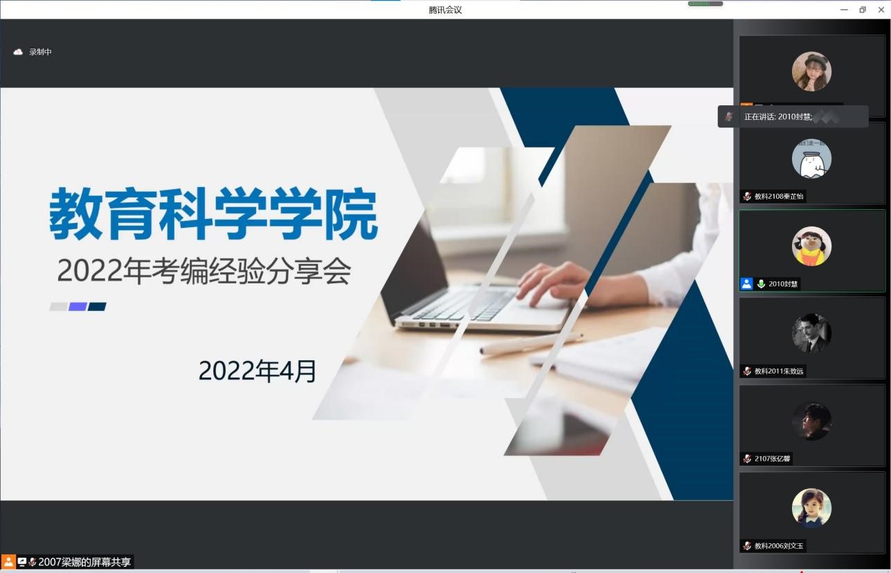 教科网4月13日电(记者 封慧 张亿馨)为增加学生对考编就业的了解,在配合疫情防控工作的前提下,教育科学学院于4月10日利用腾讯会议开展了教科院2022年考编经验分享会,百余名教科院同学参加了此次分享会。