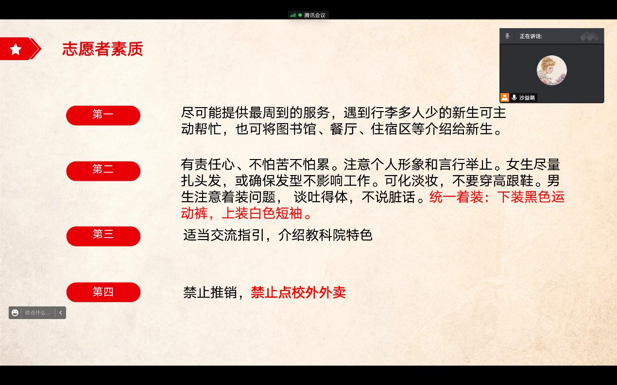 培训会上,沙益萌针对此次迎新工作的重要性,以讲演、视频的形式对志愿者提出三点要求:一要充分认识迎新工作的重要意义,注意自身形象,以饱满的热情为新生答疑解惑、提供帮助;二要通力合作,确保迎新工作在各个环节圆满顺畅;三要安全为先,提高警惕,增强新生安全意识,注意新生心理健康与情绪状态,保护人身及财产安全。她希望志愿者能积极展现学院魅力,让每一名新生在入校时感受到热情与温暖。
