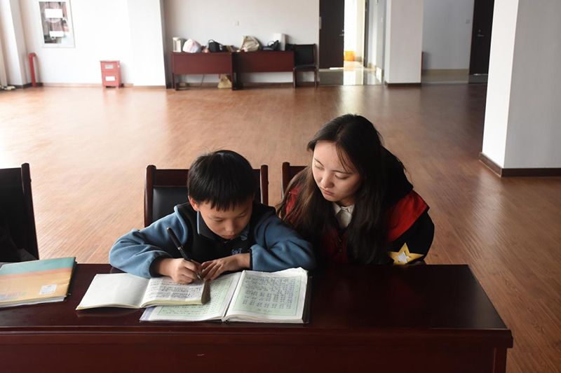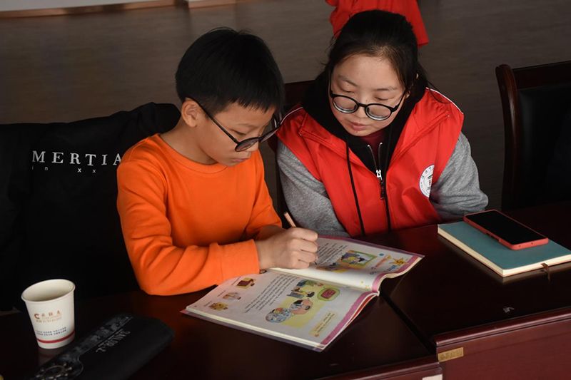 图为志愿者辅导儿童语文。记者 华雨薇 汪怡君