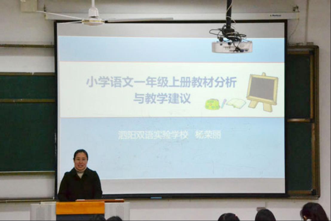 教科网11月26日电 (记者 胡梦园 王志文 )为了让小学教育专业的学生对小学教材有更多的了解,11月25日下午,淮阴师范学院教育科学学院邀请泗阳双语实验学校教科室主任杨荣丽于崇文楼阶梯教室204开展题为“小学语文一年级上册教材分析与教学建议”的专题讲座。本次讲座由教科院副院长任红娟主持,教科院部分师范生参加。