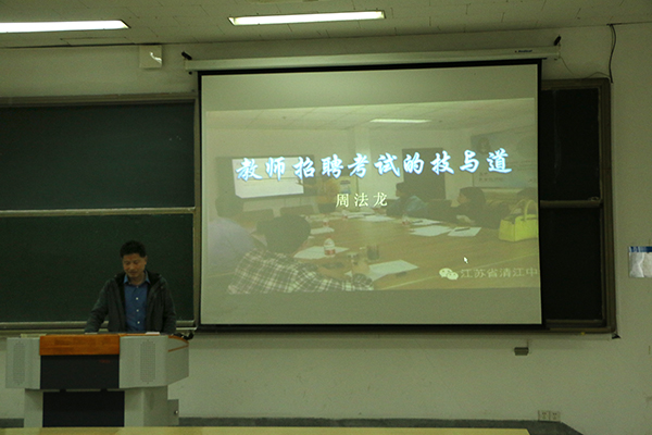 教科网4月8日电 (记者 唐朱睿 王志文)4月7日下午,淮阴师范学院教育科学学院邀请清江中学课程教学处副主任、淮阴师范学院兼职副教授、师范生实践导师周法龙于崇文楼阶梯教室103开展题为“教师招聘考试的技与道”专题讲座。本次讲座由教科院副院长任红娟主持,教科院教育技术学专业学生参加。