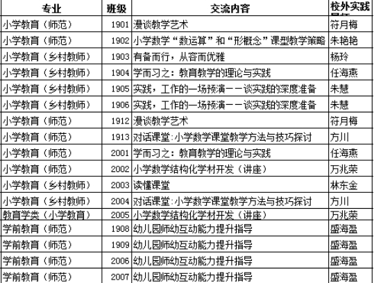 符月梅老师的“漫谈教学艺术”、朱艳艳老师的“小学教学‘数运算’和‘形概念’课型教学策略”、杨玲老师的“有备而行,从容儿优雅”、任海燕老师的“学而时习:教育教学的理论与实践”、朱慧老师的“实践,工作的一场预演——谈实践的深度准备”、方川老师的“对话课堂:小学数学课堂教学方法与技巧探讨”、万兆荣老师的“小学教学结构化学材开发”和林东金老师的“读懂课堂”等专门针对小学教育专业学生的专题培训,使大家在培训中收获教学知识和技巧的同时,明确了今后学习的主攻方向,坚定了要成为一名合格的教育者的决心。