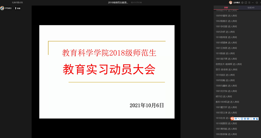 教科网10月7日电(记者 张金)10月6日下午,为进一步做好2018级师范生教育实习相关工作的部署,淮阴师范学院教育科学学院于线上召开了2018级师范生教育实习动员大会,本次会议由教科院副院长任红娟主持,实习指导老师及2018级学生参加会议。