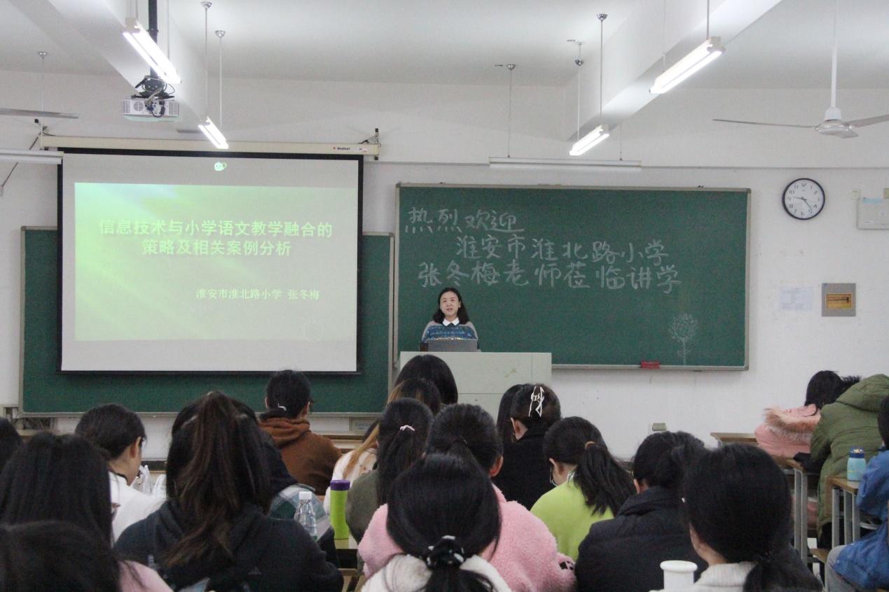 教科网11月17日电(记者 魏笑 吴雪纯)为了丰富教育手段,促进信息技术与小学语文教育相融合,11月16日上午,淮阴师范学院教育科学学院邀请淮阴区小学语文“骨干教师”、淮北路小学的张冬梅老师于弘文2-403作题为《信息技术与小学语文教学融合的策略及相关案例分析》的讲座。本次讲座由教科院谢同祥教授主持,教科1901班和1912班全体同学参加了本次讲座。
