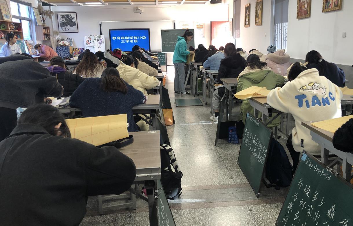 “三字”考核的内容是粉笔字、钢笔字和毛笔字。作为师范生的必备技能,对于“三字”的考核倍受大家的重视。同学们按时到达相应的教室有序进行考核。在考核过程中,同学们对于自己在“三字”方面的实力有了更加客观准确的判断。
