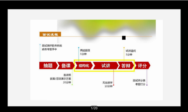 小学教育(文)培训伊始,任红娟向大家介绍了教师资格证面试流程,包括抽题、备课、结构化、试讲、答辩及评分。之后她分别从抽题室、备课室、面试室三关为同学们展开具体解答。