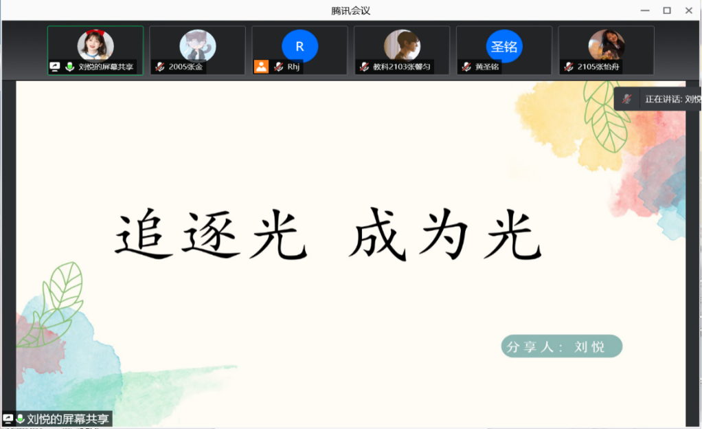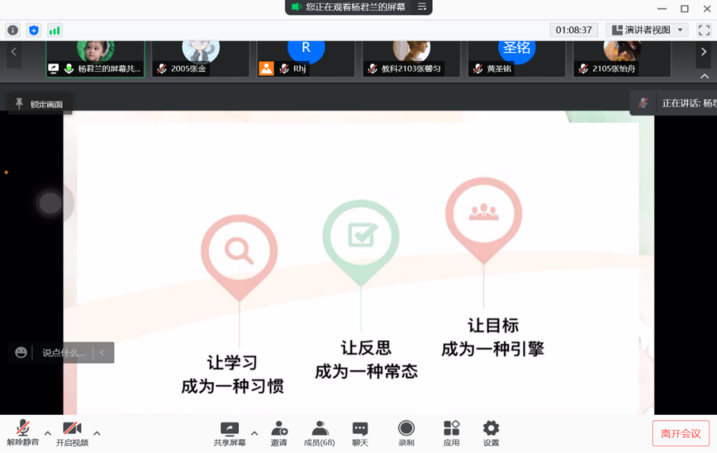 2016级毕业生杨君兰回忆了自己的大学学习生活,并建议学弟学妹要明确自己的目标,学习好专业知识,夯实好学习基础,培养学习能力。对于师范生来说口语表达很重要,她建议平时可以多参加一些演讲类的竞赛,培养自己的口语能力。杨君兰表示缓解压力最好的办法是找到前进的方向,做好时间规划,避免随波逐流。2016级毕业生刘悦向同学们分享了在淮师的点点滴滴的照片和自己在卓越班学习的经历,她表明在面对困难时,不能选择逃避,要积极的去解决问题,打破惯性勇敢面对短板,才能突破自我束缚。要抓住各种活动给自己带来的机遇和挑战,努力成为更好的人。