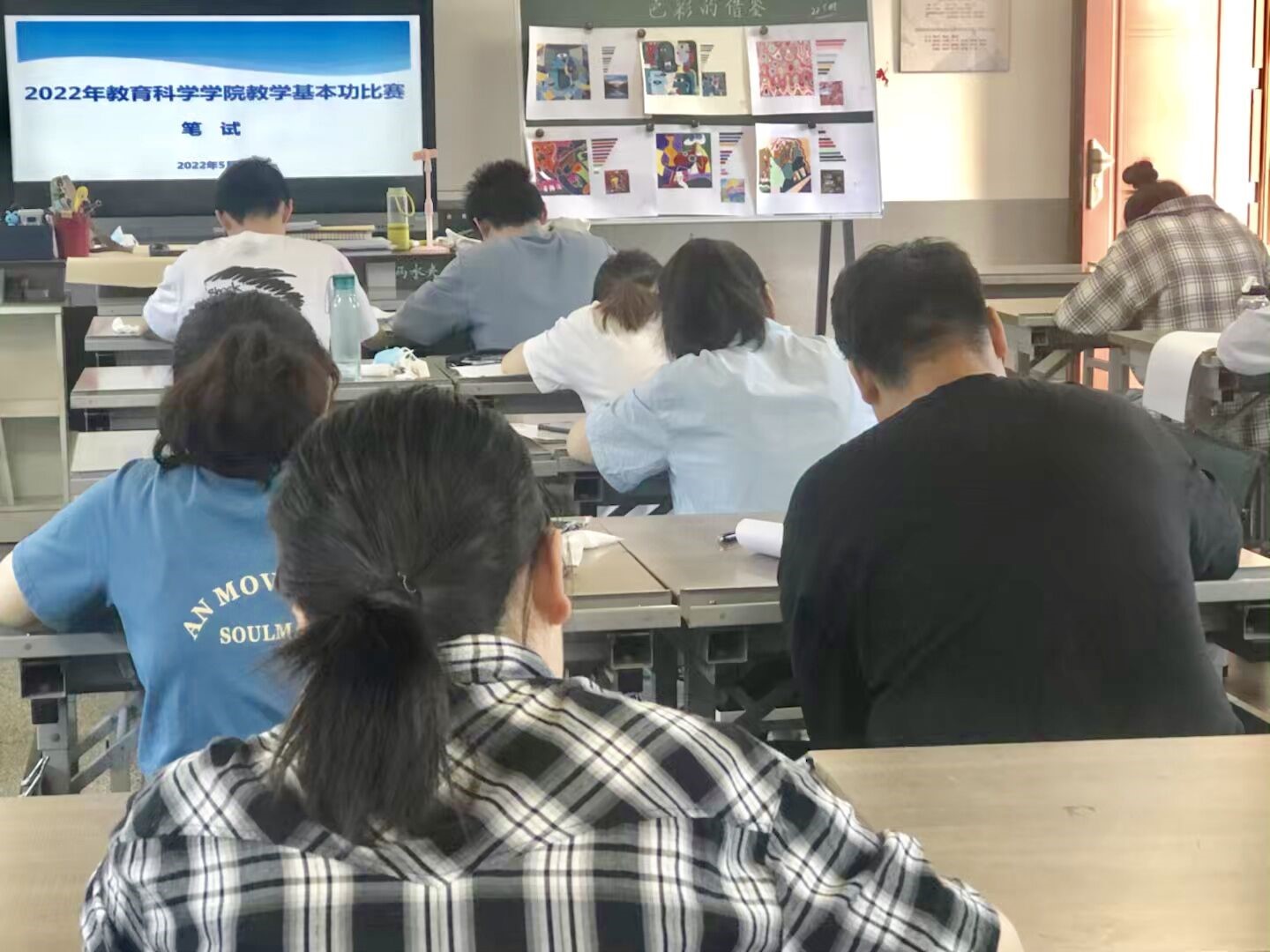 第一阶段为专业笔试部分。小学教育、学前教育、教育技术三个专业共72名同学参加了5月27日下午的初赛。参赛同学在教科院1号楼教室进行了专业知识考试以及粉笔字、钢笔字考核。学前教育专业同学按照主题要求创作了儿童画,认真观看了幼儿活动视频并撰写了儿童行为观测分析表。