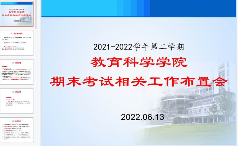 教科网6月14日电(记者 赵影)6月13日晚,教育科学学院召开2021-2022学年第2学期期末考试相关工作布置会。会议由教科院副院长任红娟主持,教科院全体教师参加会议。
