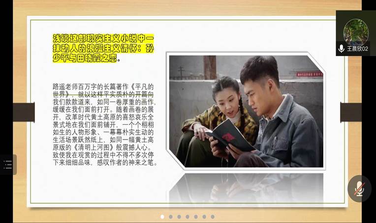 最后,王晨欣小组带来了小说《平凡的世界》的一些阅读感悟。王晨欣说:“中国的农民是处在社会最底层的,正因如此,他们身上才具备了别的群体所不具备的更多优秀品质,如坚韧、顽强、愿意付出、待人真诚等,我们个人在生活中同样需要具备这些品质”。