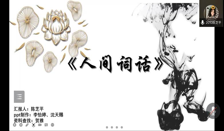 首先由陈芝平小组分享书目《人间词话》的阅读收获,主要从作者简介、书籍概况、境界说、相关摘录和后世影响等五个方面展开?!度思浯驶啊肥峭豕邮芰宋餮竺姥枷胫蠢窈?,以崭新的眼光对中国旧文学所作的评论。它具备理论体系,在近现代词论界影响深远,具有哲学意义和人生指导意义,值得阅读。